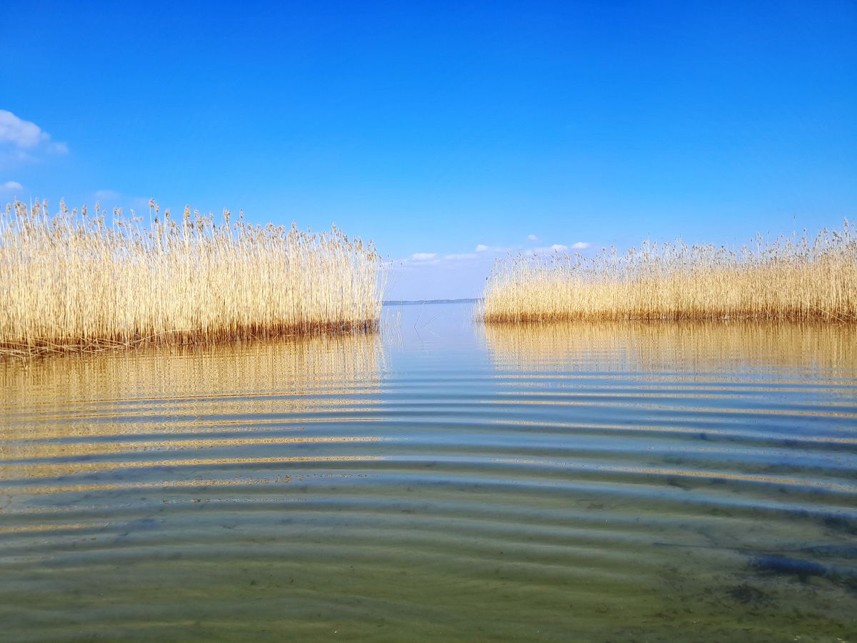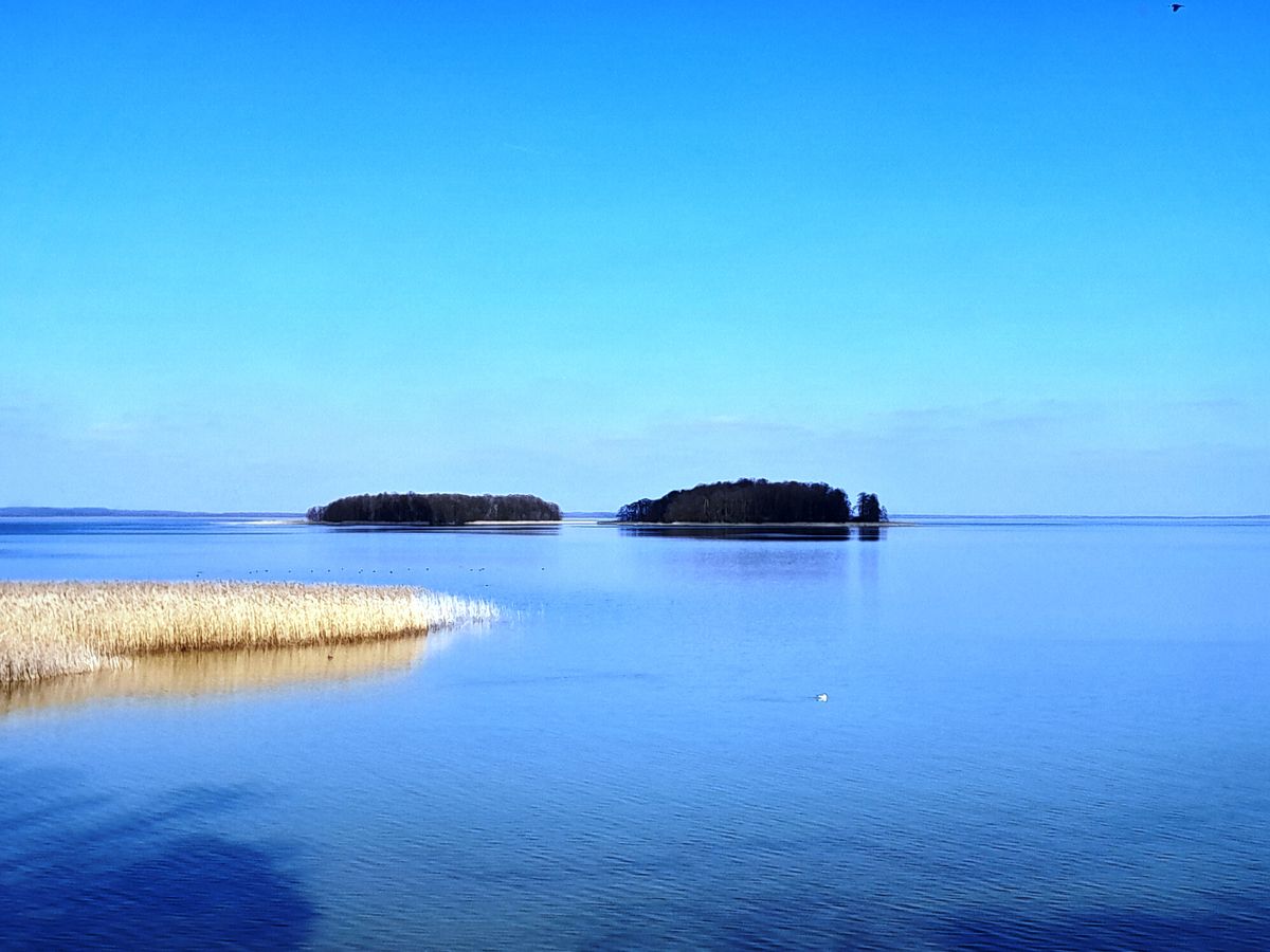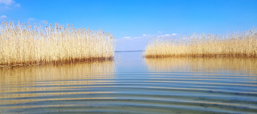 "Wąską cieśniną wypływa żaglówka na przeogromną płaszczyznę Śniardw. Zrobiło się dziwnie spokojnie, najmniejszy podmuch nie mąci wodnego lustra. Żagle licznych łodzi zastygły w bezsile. Jasne kumulusy przeglądają się w ciemnoniebieskiej toni. Niewyraźną linijką majaczy odległy brzeg, w kilku miejscach horyzont prawie zupełnie zlewa się z wodą albo w ogóle niknie w spowiciu delikatniutkiej mgiełki. Woda opalizuje, połyskuje polami mocno polerowanego srebra. Stadko mew przysiadło, znieruchomiało, jakby i je urzekło poranne słońce.