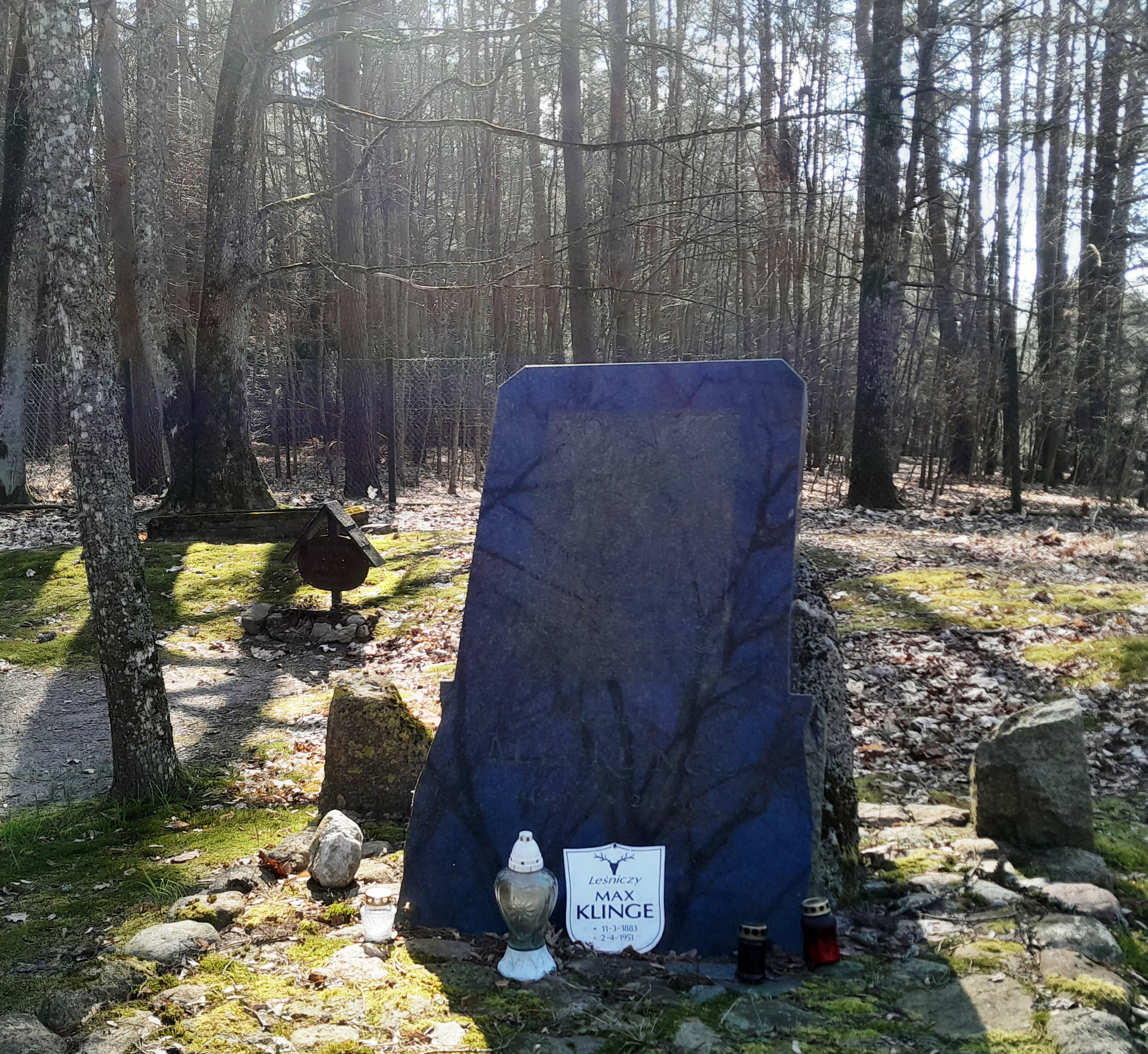 Max Klinge Spoczął na małym cmentarzu w Niedźwiedzim Rogu, wśród drzew, które sadził i pielęgnował. W 61 rocznicę śmierci postawiono nowy pomnik. Z zielonego granitu, bo taki pasował do leśnika. Zastąpił on wcześniejszy dębowy krucyfiks. Wykonał go Andrzej Arcimowicz, plastyk i projektant oraz autor książki "W Wejsunach i nieco dalej". Stary grób Klingego pokazał mu zmarły w 2012 roku Michał Issajewicz, jeden z wykonawców wyroku na kata Warszawy Franza Kutscherę.