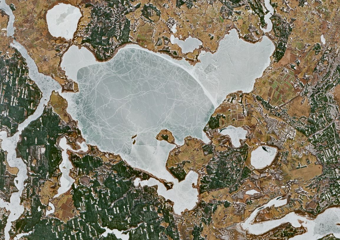 Zdjęcie satelitarne pokazuje, że tafla jeziora Śniardwy utraciła jednolitą strukturę – jej powierzchnia jest poprzecinana gęstą siecią pęknięć, co oznacza, że lód jest poddawany silnym naprężeniom i może w każdej chwili zacząć pękać pod wpływem wiatru.