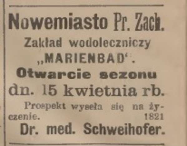 Zapewne wśród licznie odwiedzających nowomiejski zakład było wielu gości spoza naszego powiatu. Zakład reklamował się w całych Prusach, o czym świadczą chociażby ogłoszenia w Gazecie Toruńskiej. Z informacji w nich zawartych można dowiedzieć się, że w 1903 roku otwarcie sezonu w „Marienbadzie” odbyło się dnia 15 kwietnia, natomiast w 1904 roku — 1 maja. Ponadto z ogłoszeń zamieszczanych w prasie wynika również, że „Dr. med. Schweihofer oferował ceny umiarkowane”, a na życzenie przysyłał „prospekta”.