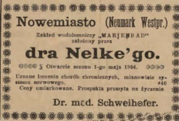 15 października 1902 roku Gazeta Toruńska w wiadomościach informowała: "w Nowemmieście Prusy Zachodnie zmarł znany w szerszych kołach lekarz tutejszy, dr Nelke. Założył tu lecznicę wodną, która wielu chorym z pomyślnym skutkiem posłużyła”. Po jego śmierci zakład przejął Dr H. Schweihofer, który w ówczesnej prasie ogłaszał: „Osiedliłem się w Nowemmieście n/Dr. Jako lekarz praktyczny mieszkam naprzeciw kościoła katolickiego. Wodoleczniczy zakład Kneipowski przejąłem także po śp. Dr. Nelkiem”.
